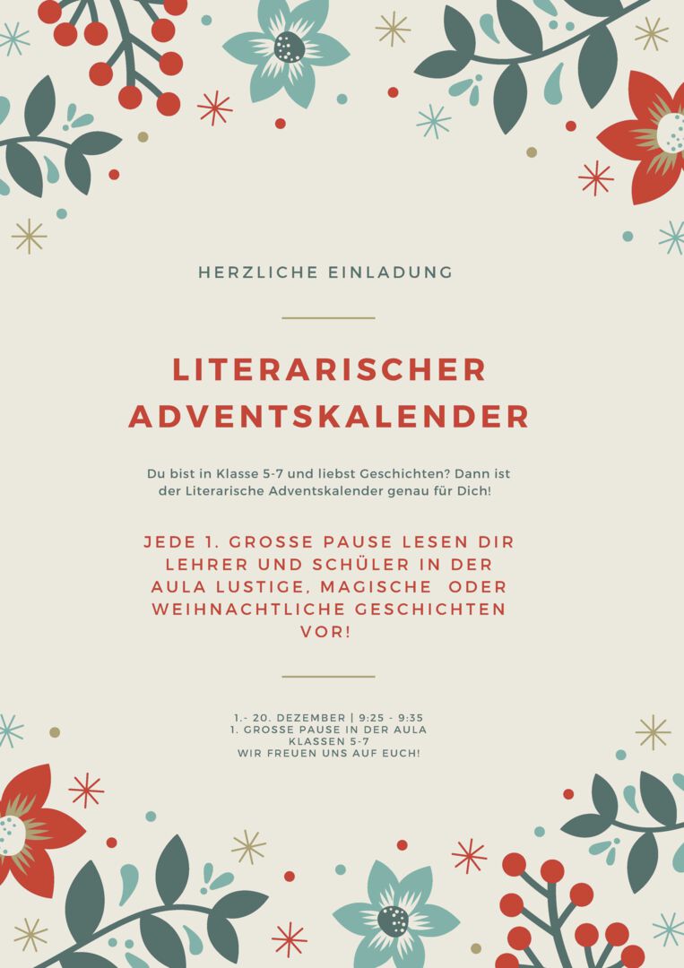 Du bist in Klasse 5-7 und liebst Geschichten? Dann ist der Literarische Adventskalender genau für Dich! Jede 1. große Pause lesen dir Lehrer/innen und Schüler/innen in der Aula lustige, magische …